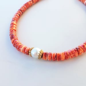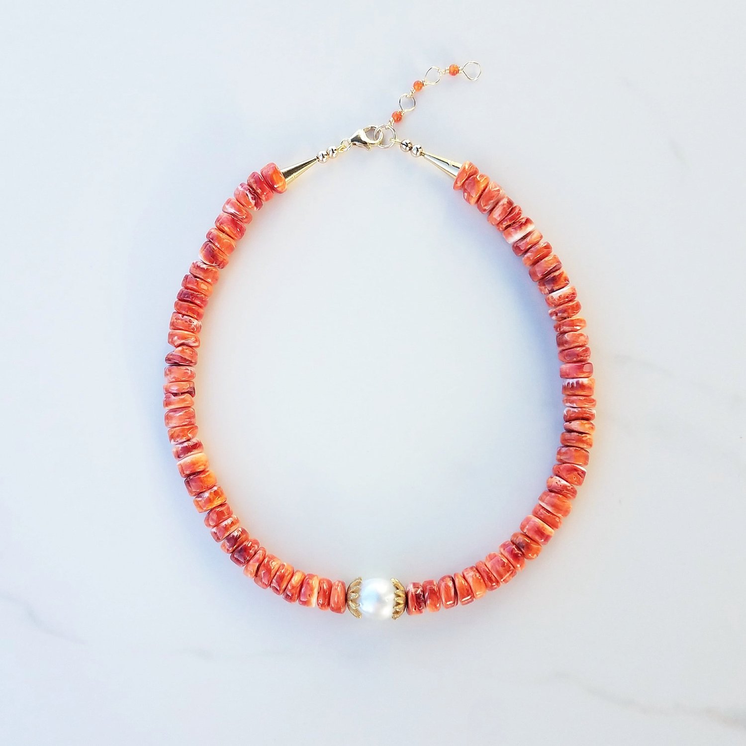 South Sea Australian Pearl enclosed by Vintage Gold tone scalloped ends, rests in the middle of orange Spiney Oyster Shells. Yellow Gold Fill clasp, wire, & ends. Carnelian bead extension for adjustable lengths.