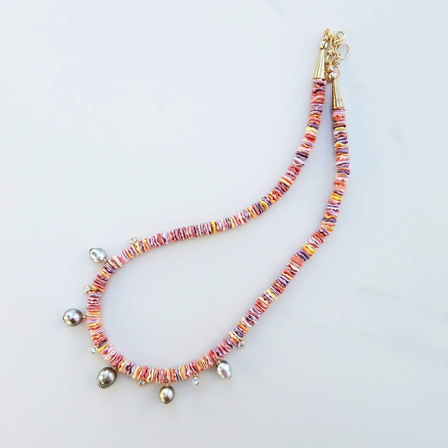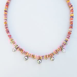 Colorful & bright shell discs are accompanied by beautiful natural Keshi Tahitian Pearls in this fun-loving island feel necklace. Shell discs in orange to yellow & lavender to intense pink tones, make way for 5 silvery Tahitian Keshi Pearls to drop from the necklace, along with bezel set CZ accents. Gold Fill wire work, clasp, & components. Adjustable lengths are from 15.5 to 16.5 inches.
