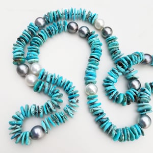 Decadent & substantial are the first words that come to mind when holding this necklace. Gorgeous & massive Tahitian & South Sea Pearls pop from sky blue Turquoise.